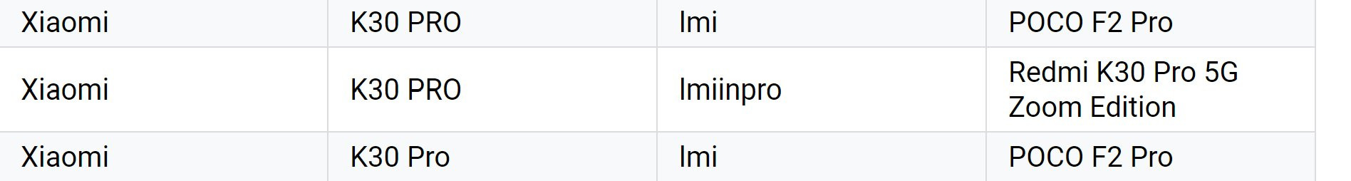 Nové informace byly zjištěny ze seznamu podporovaných telefonů Google Play, kde se objevila nová Xiaomi zařízení s kódovým označením „lmi“, které patří Redmi K30 Pro. Seznam rovněž odhalil, že model Redmi K30 Pro 5G Zoom Edition se na globálním trhu objeví pod označením Redmi K30 Pro.
