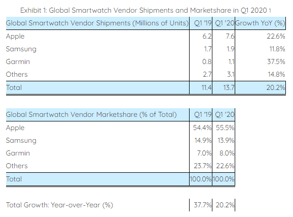 Z tabulky můžeme vidět, že v Q1 2020 bylo dodáno 13,7 milionů kusů chytrých hodinek, což dělá meziročně nárůst 20,2 procent. Nárůst je podle Strategy Analyrics způsoben i tím, že před vypuknutím pandemie covidu-19 si mnoho lidí pořídilo hodinky pro sledování zdraví a fitness aktivit během karantény. Nicméně ve druhém čtvrtletí tohoto roku už Strategy Analytics očekává, že dodávky značně klesnou.