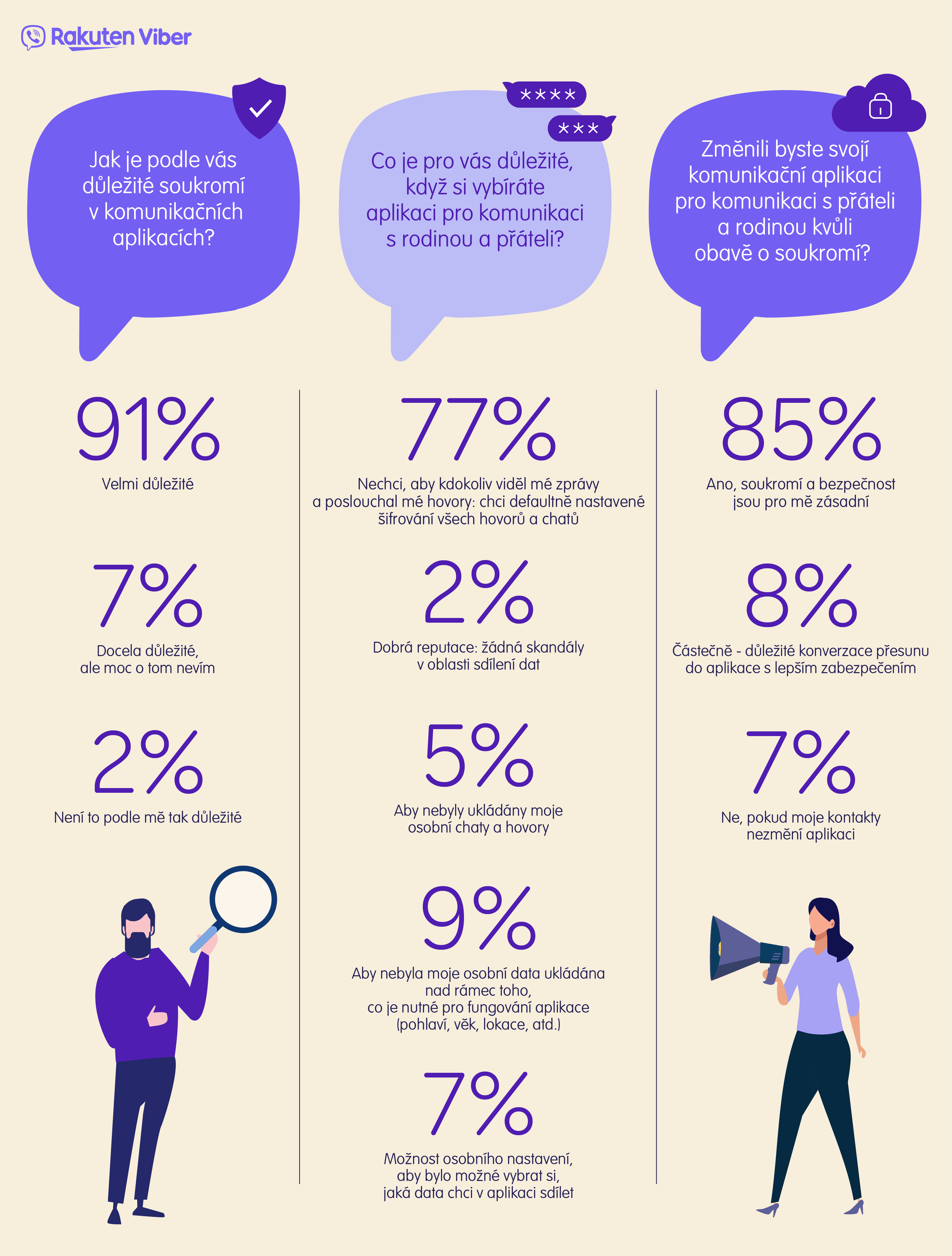 Pro uživatele je nejdůležitější, aby bylo v komunikaci možné nastavit funkce pro soukromí a aby byly jejich konverzace defaultně šifrované na obou koncích. 77% českých účastníků průzkumu uvedlo, že je pro ně prioritou, aby jejich konverzace byly soukromé. Dalších 9% odpovědělo, že je pro ně důležité, aby jejich data nebyla sbírána a sdílena nad rámec toho, co je potřeba pro fungování aplikace.