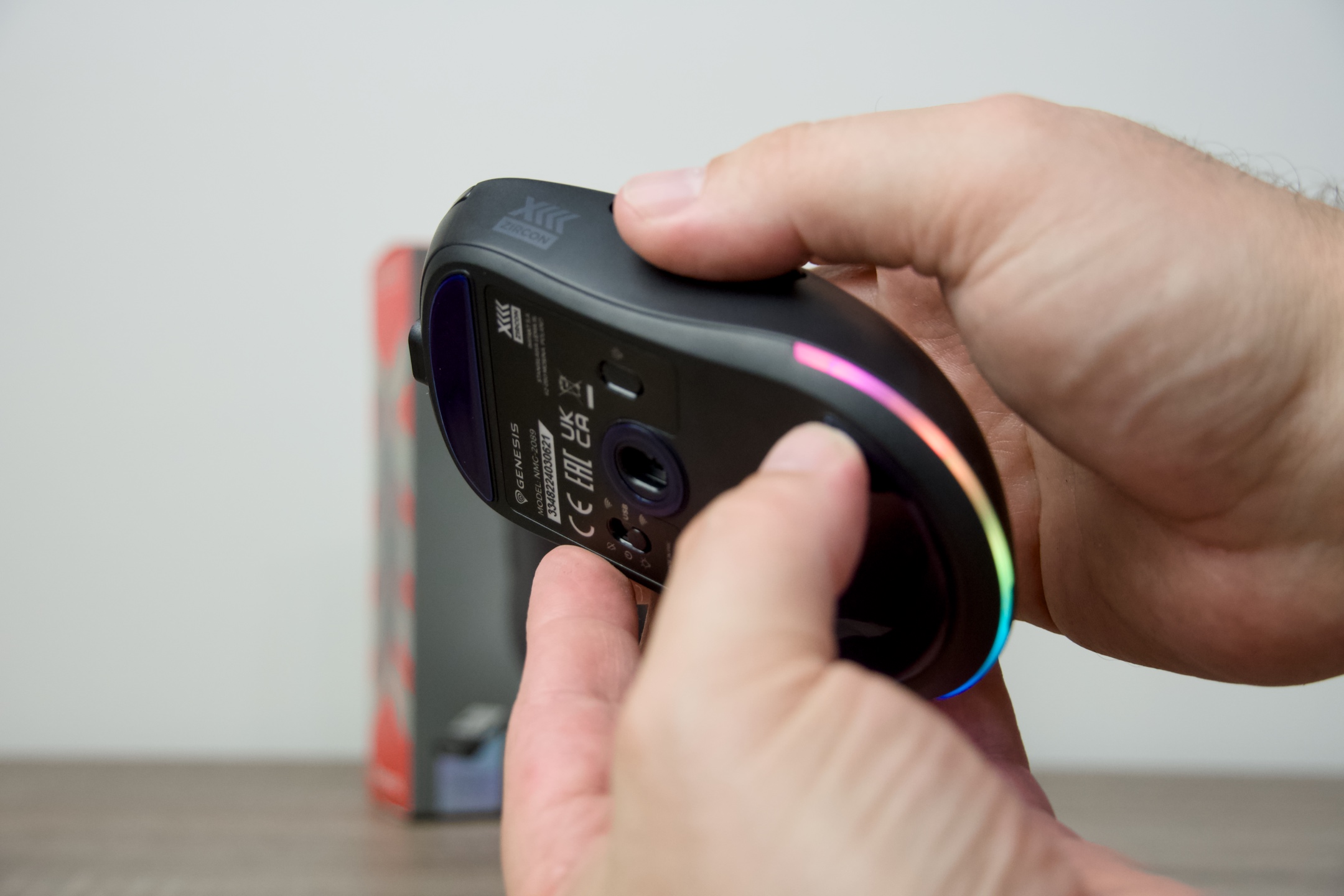 Zirkon XIII má v nejširším bodě 62, na délku 119 a výškově zabere 40 mm. To vše při hmotnosti pouhých 77 g. Myš je dobře tvarovaná a na jejím těle tvořeném odolným černým plastem (výrobce má v nabídce i bílou variantu) najdete 7 programovatelných tlačítek. Konkrétně 2 primární, menší dvoupolohové za kolečkem, jemuž je kromě rolování přiřazena také funkce stisknutí, a jako poslední dvojici těch postranních k ovládání zvolených parametrů palcem. Do vnořeného konektoru USB-C situovaného vpředu přiložený kabel dobře zapadá a vzhledem k dostatečné distanci od povrchu nijak výrazně nezavazí, pročež je i tento způsob využití velmi komfortní. Na spodu pak na levé straně narazíte na přepínač, jež ovlivňuje podsvícení, přičemž ve střední poloze zároveň funguje jako vypínač, zatímco vpravo slouží symbol rozsvícené žárovky pro výběr světelného módu. Posledním prvkem je zde pojistka, jež zajišťuje soudržnost se základnou.