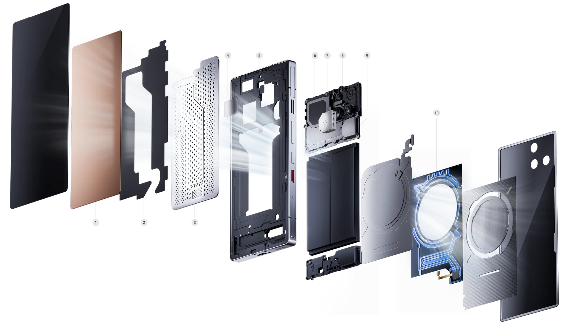 Po rozebrání telefonu je možné spatřit modrou chladicí kapalinu, která obíhá přes průhledné okénko na zádech REDMAGIC 11 Pro. Celý systém funguje podobně jako chladič v autě – využívá vzduchové průduchy a aktivní ventilátor k rozptýlení tepla. Zajímavostí je mikropumpa s piezoelektrickou keramikou vibruje podobně jako reproduktor a pohání kapalinu v uzavřeném okruhu.