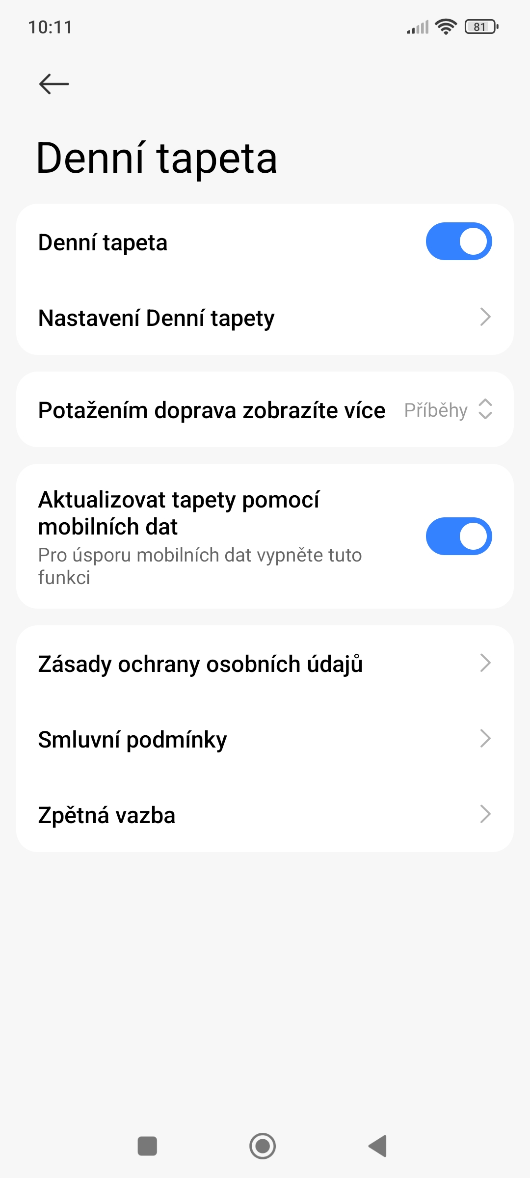 • Níže si vyberte, jestli chcete Denní tapetu aktualizovat prostřednictvím mobilních dat