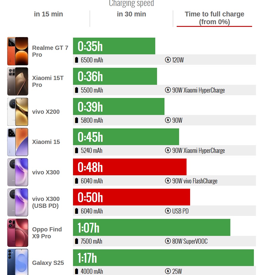 Plné nabití závisí na rychlosti nabíjení a velikosti baterie. Například u Realme GT 7 Pro, které má 6 500mAh akumulátor a 120W nabíjení, se z 0 na 100 % dostanete za pouhých 35 minut. Xiaomi 15T Pro má jen 5 500mAh baterii a 90 W, ale naplno ho dobijete za 36 minut. Na samém konci žebříčku je kupodivu iPhone 17 Pro, který má 3 988mAh akumulátor a 35W nabíjení, takže mu to trvá 1 hodinu a 18 minut. A jen o minutu rychlejší je podle testů Samsung Galaxy S25.