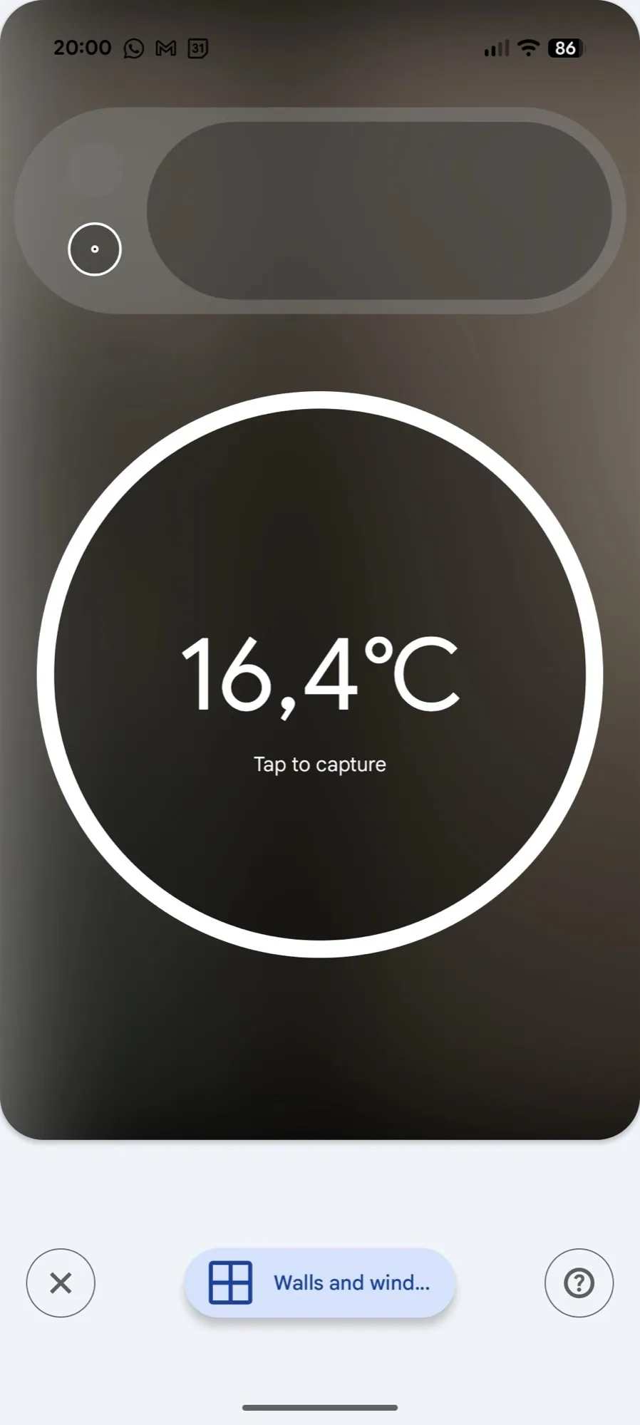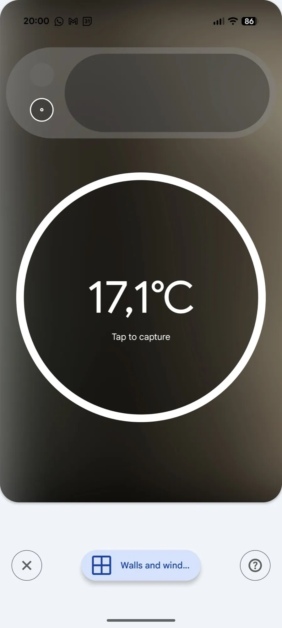 V aplikaci Thermometer lze zvolit typ povrchu – například Okna a zdi – a následně jednoduše přiložit telefon ke sklu, stěně nebo hliníkové části dveří. Pixel zobrazí aktuální povrchovou teplotu s přesností na desetiny stupně. Uživatelé tak snadno porovnají například teplotu skla, žaluzií i hliníkového rámu francouzských dveří a zjistí, kde dochází k největší tepelné ztrátě.