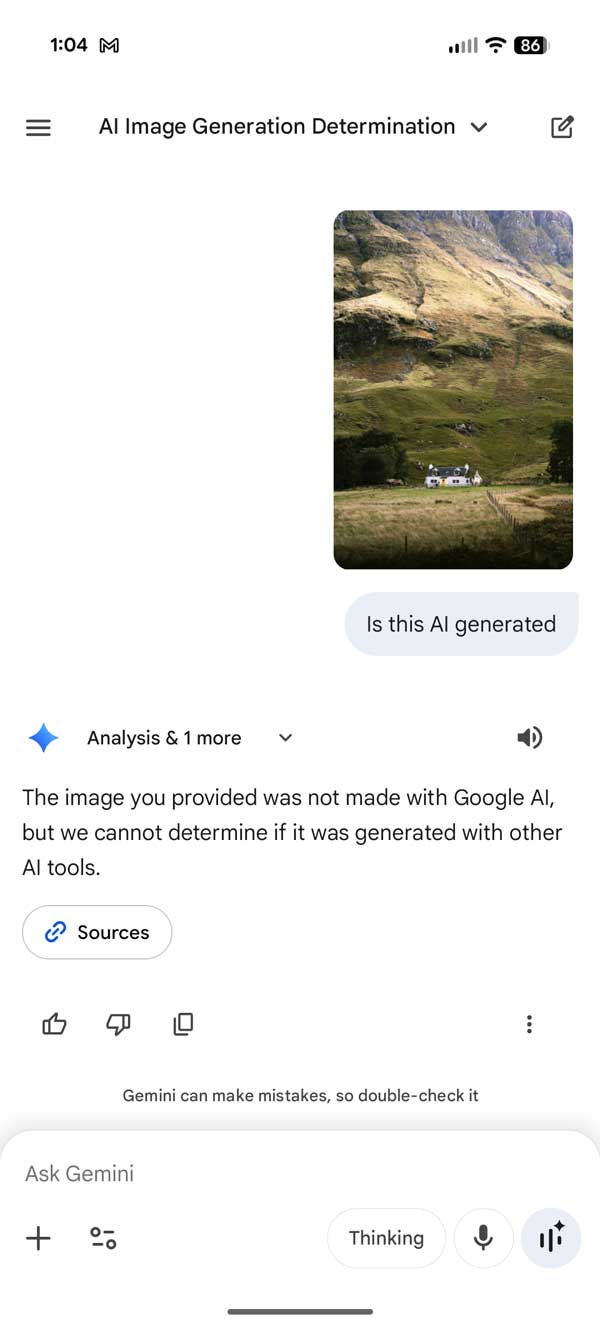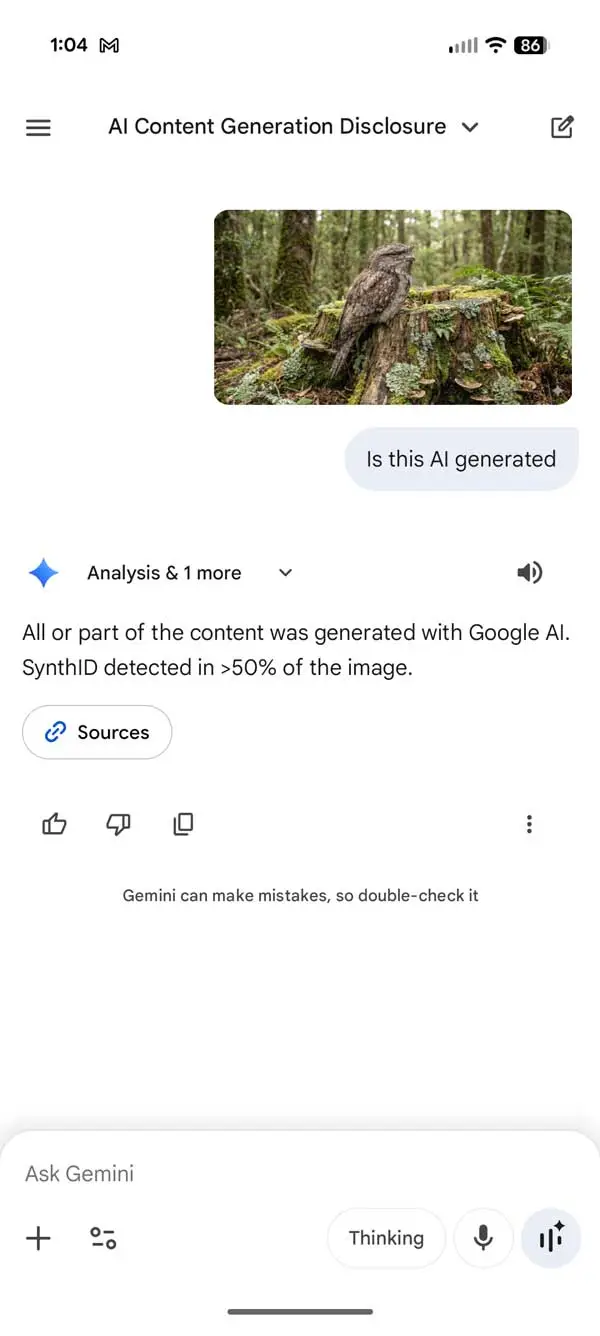 5. Gemini následně analyzuje obsah, a pokud detekuje SynthID značku, s jistotou potvrdí, že se jedná o AI obrázek (třeba vygenerovaný prostřednictvím Nano Banana).