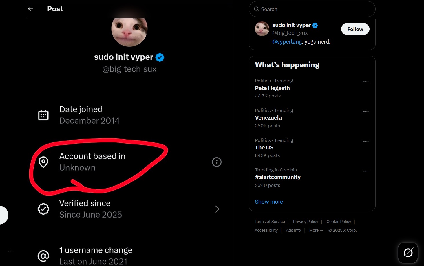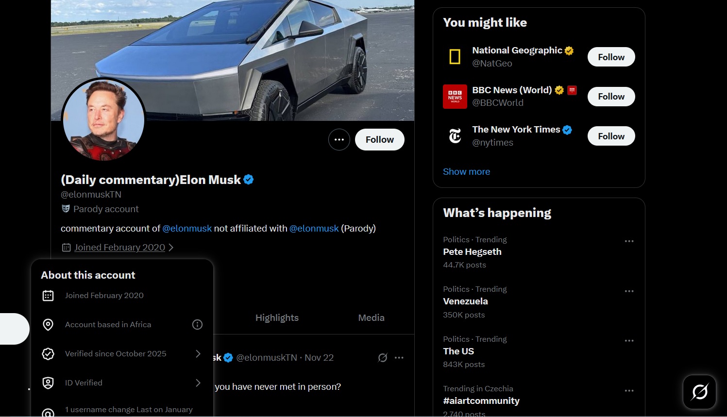 Síť X nenápadně přidala funkci „O tomto účtu“, která se nyní zobrazuje u účtů všech uživatelů. Cíl byl přitom nevinný – zobrazit zemi nebo region, ve kde byl účet založen. Podle vyjádření vedoucího produktového oddělení společnosti, Nikity Biera, jde o „důležitý první krok k zajištění integrity globálního veřejného prostoru.“ Dalším krokem přitom má být nabídka více způsobů, jak mohou uživatelé ověřit autenticitu obsahu, který na síti X vidí.