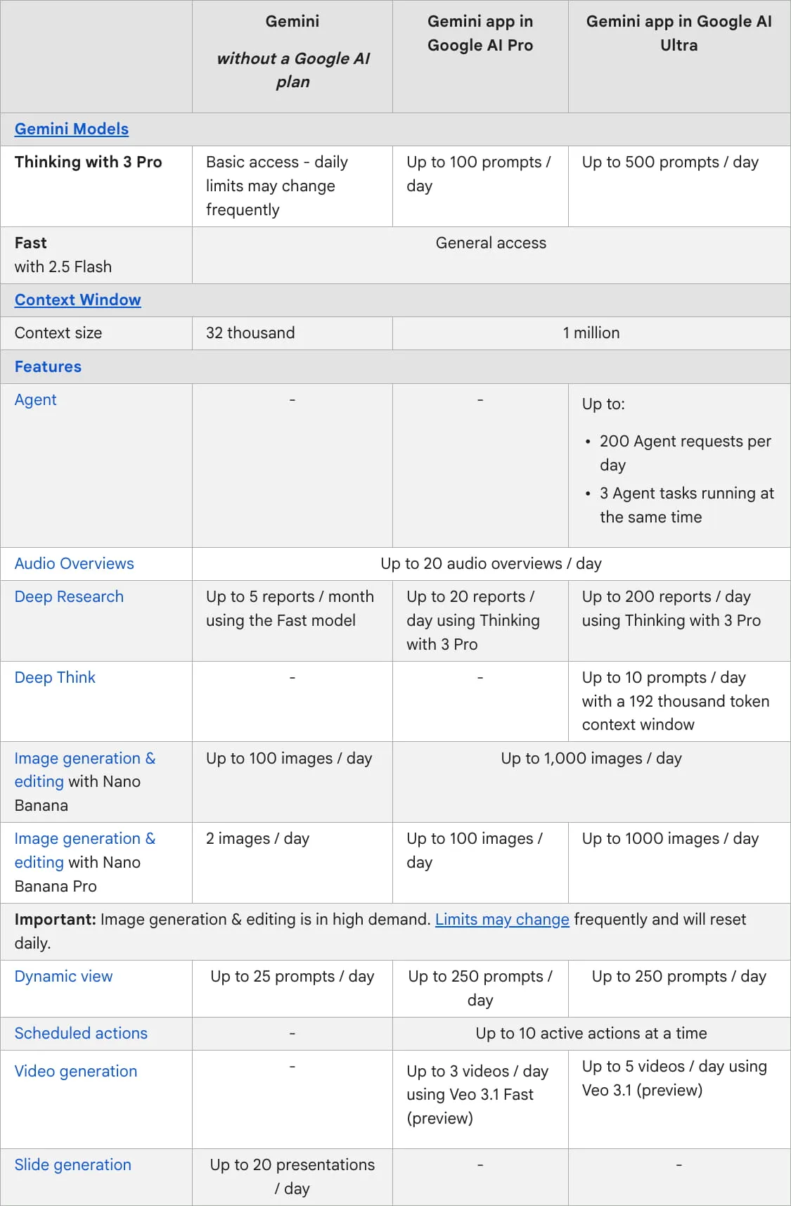Původně měli neplatící uživatelé Gemini přístup až k 5 textovým výzvám denně a možnost vygenerovat až 3 obrázky denně. To odpovídalo i předešlému modelu Gemini 2.5 Pro. Nově je však u předplatného uvedeno pouze „základní přístup“. To naznačuje, že denní limity se mohou často měnit bez pevného počtu.