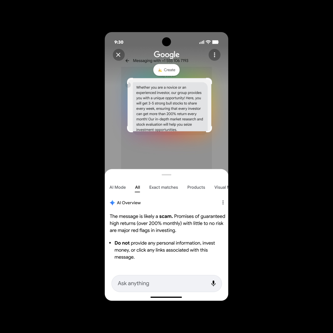 A s tím trochu souvisí i třetí nenápadná novinka ve Zprávách Google. Funkce Circle to Search vám totiž velmi rychle umožní zjistit, jestli nějaká zpráva vypadá jako podvod. Díky integraci s AI Overview prohledá dostupné informace na webu a vyhodnotí, jestli to vypadá na podvodníka nebo ne. Přesto je dobré nevěřit tomuto vyhodnocení na 100 % a používat i svůj vlastní rozum.