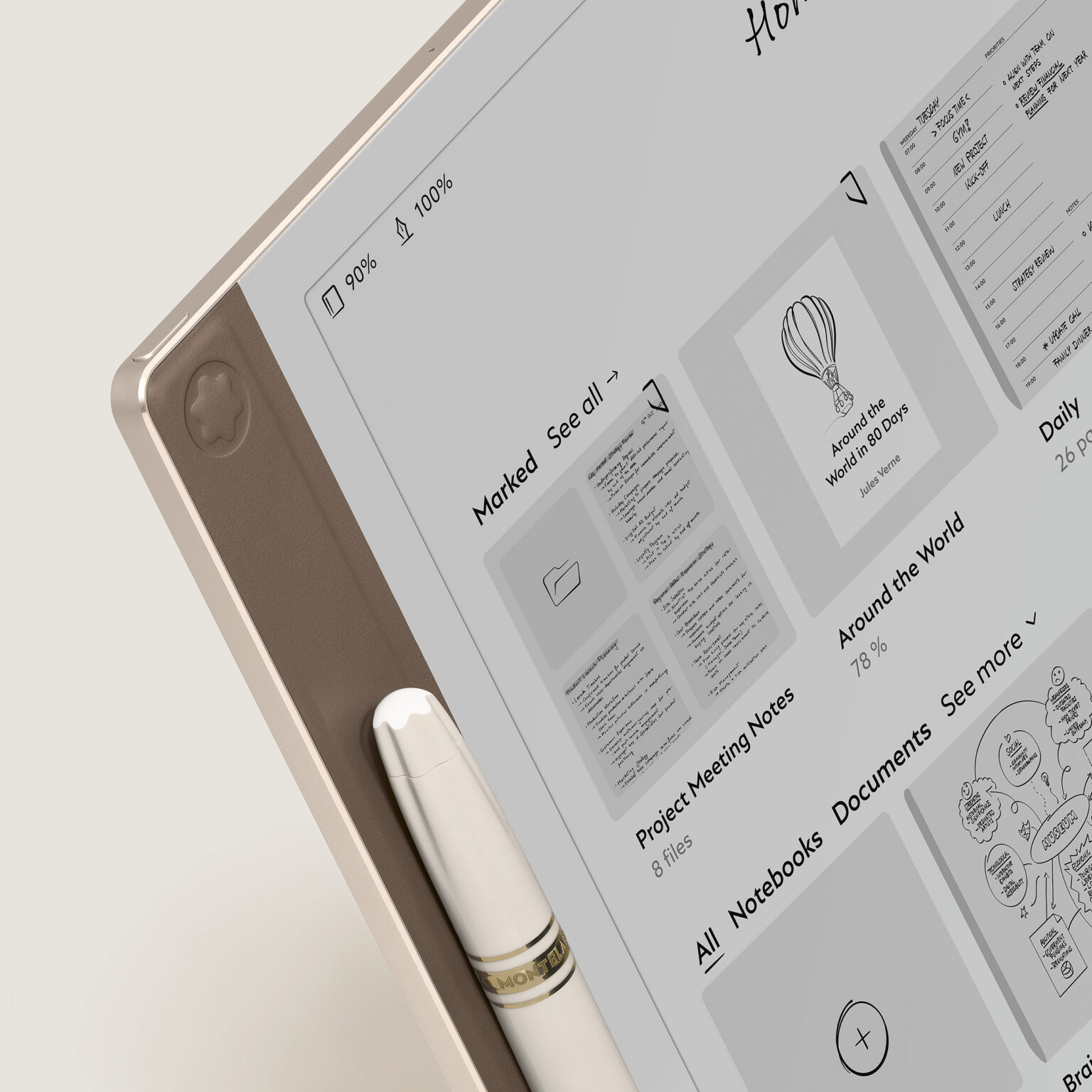 Digital Paper od Montblanc působí jako digitální zápisník, který vám nevnucuje stovky funkcí, ale dává prostor právě tam, kde ho chcete mít – tedy mezi myšlenkou a jejím prvním obrysem na stránce. Ať už začínáte na prázdném listu, upravujete dokument nebo jen zachycujete nápady a poznámky, všechno působí právě díky důrazu na minimalismus při používání nečekaně přirozeně. Aby vám bylo psaní na Digital Paper maximálně příjemné, jsou k dispozici tři vyměnitelné hroty digitálního pera, které mění charakter tahu tak věrně, až máte pocit, že držíte jeden z klasických Montblanc per. Jen vám tentokrát neubývá inkoust, ale roste počet poznámek v cloudu.
