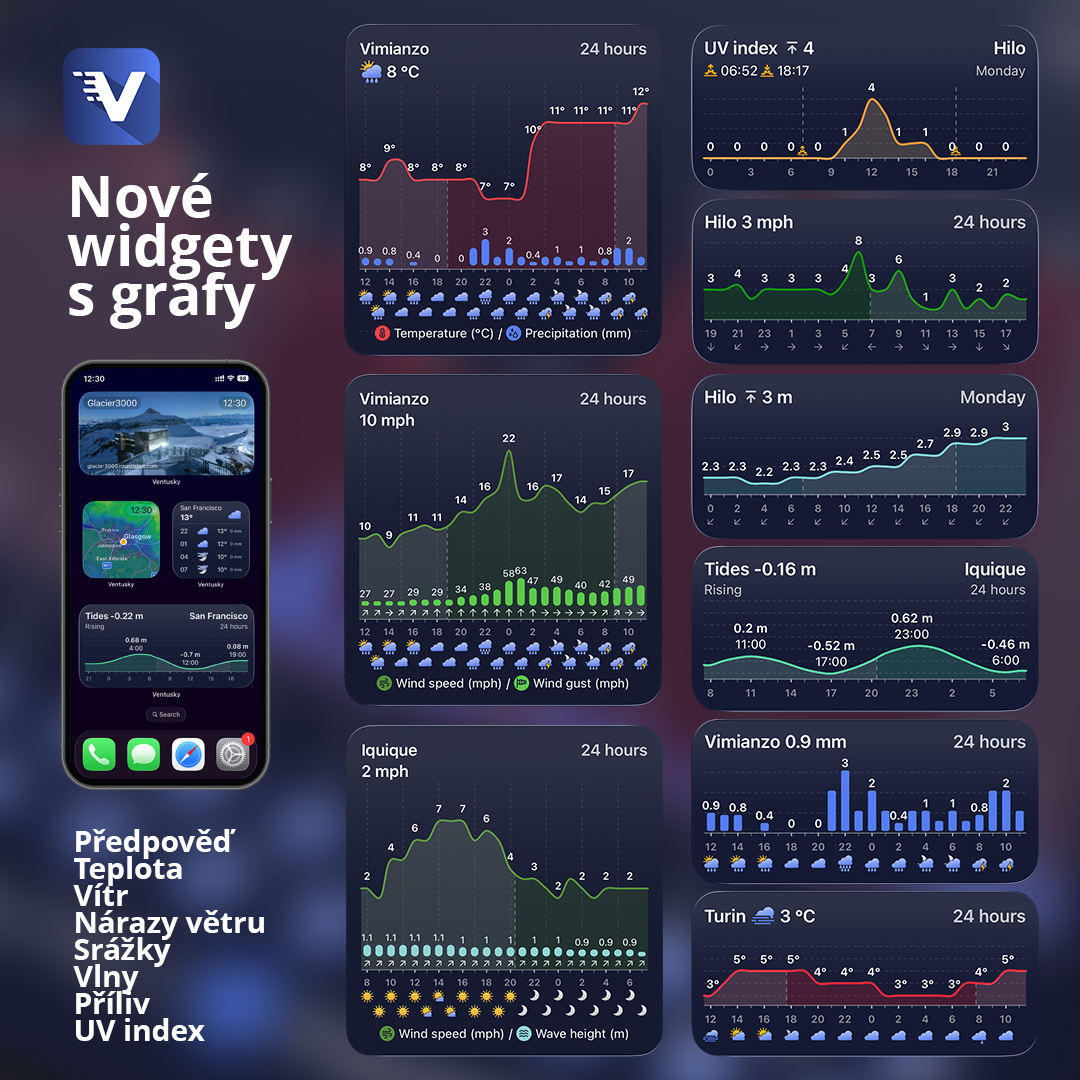 Ventusky je mělo už dřív: klasickou předpověď, živý radar i webkamery. Teď ale přidává něco, co je pro spoustu lidí nejpraktičtější: oblíbené podrobné grafy z aplikace přímo na plochu iPhonu. A že jich je!