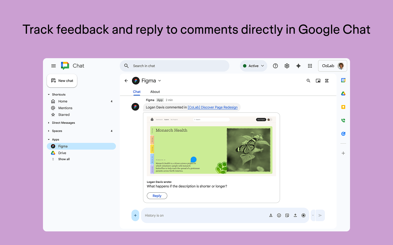 Integrace je postavená hlavně na praktičnosti. V konverzaci uvidíte náhled souboru a rovnou i kontext, co se v projektu děje. Největší přínos ale vidím v tom, že se dá na komentáře odpovídat přímo z Google Chat – bez přepínání do Figma v prohlížeči. V reálu to dokáže zrychlit celý proces (a snížit počet „už jsi to viděl?“ zpráv).