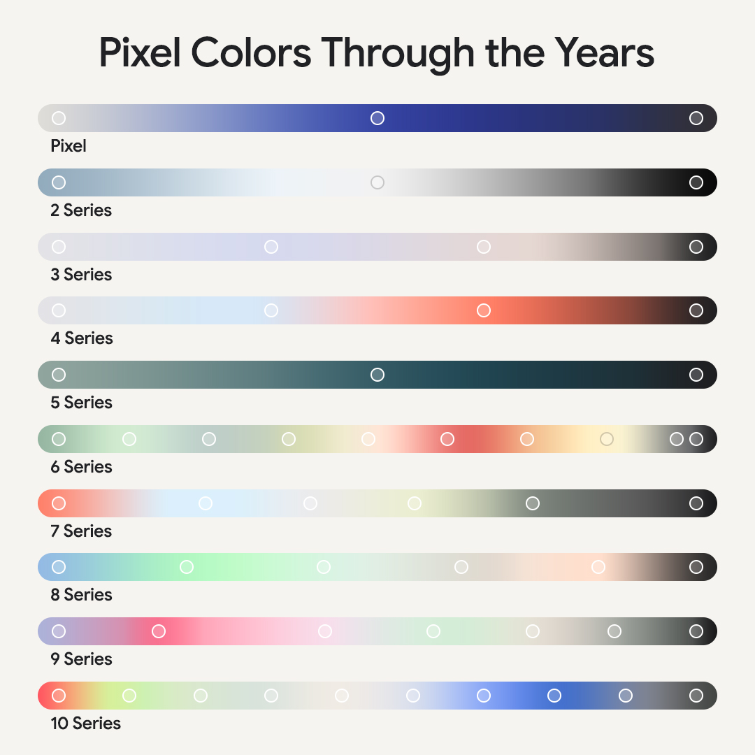 Google nyní na sociálních sítích zveřejnil barevnou paletu, která jasně ukazuje, jak se vyvíjely odstíny od prvního Pixelu až po řadu Pixel 10. A můžeme z toho odvodit, jak to bude u série Pixel 11. Ta vyjde až v létě, ale s ohledem na Pixel 10 se také jistě dočkáme neotřelých odstínů, které zaujmou už na první pohled. A mohlo by jich být zhruba 7. Konkrétní informace ale zatím chybí.