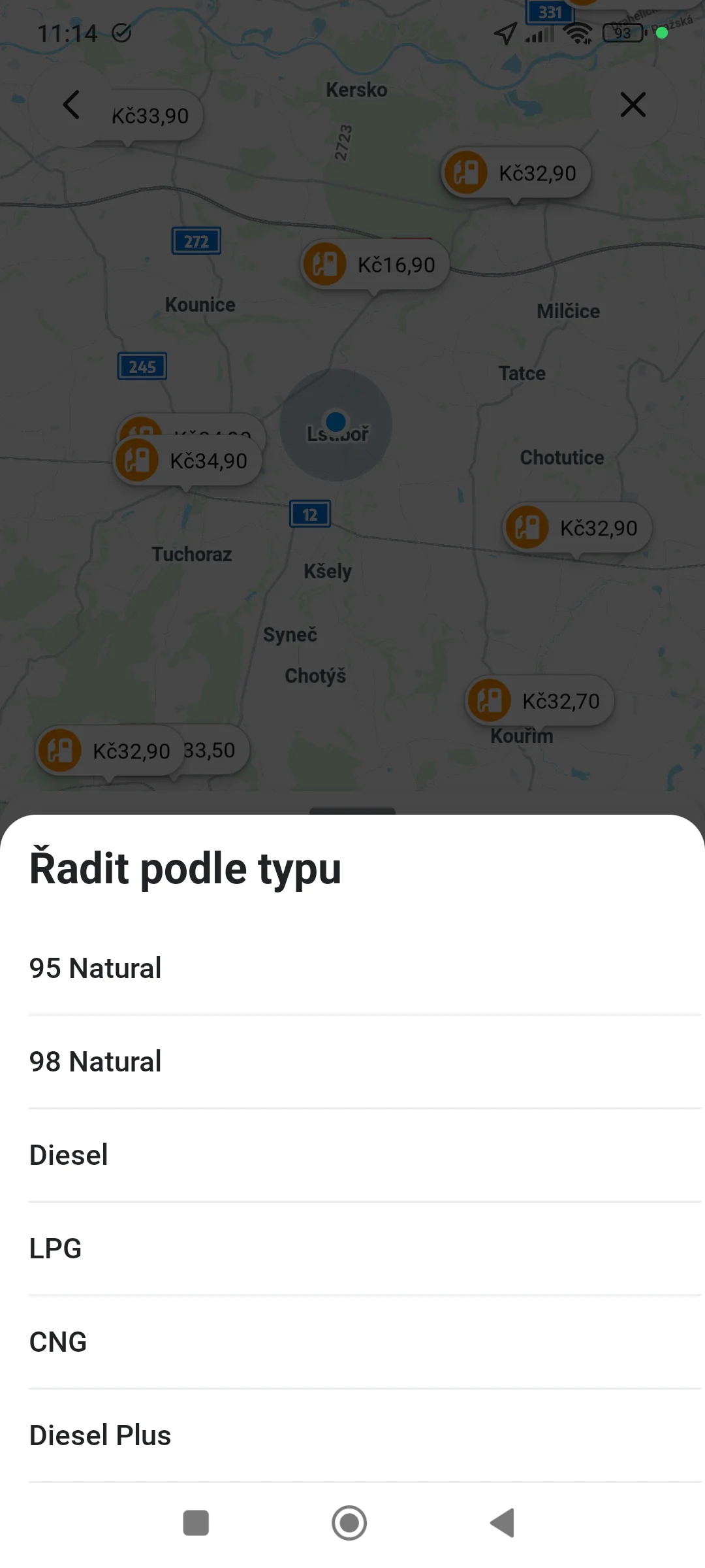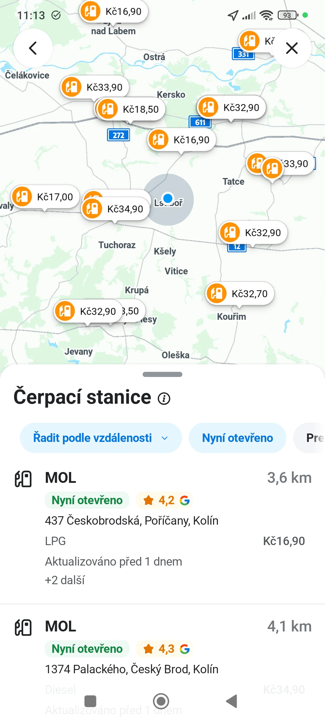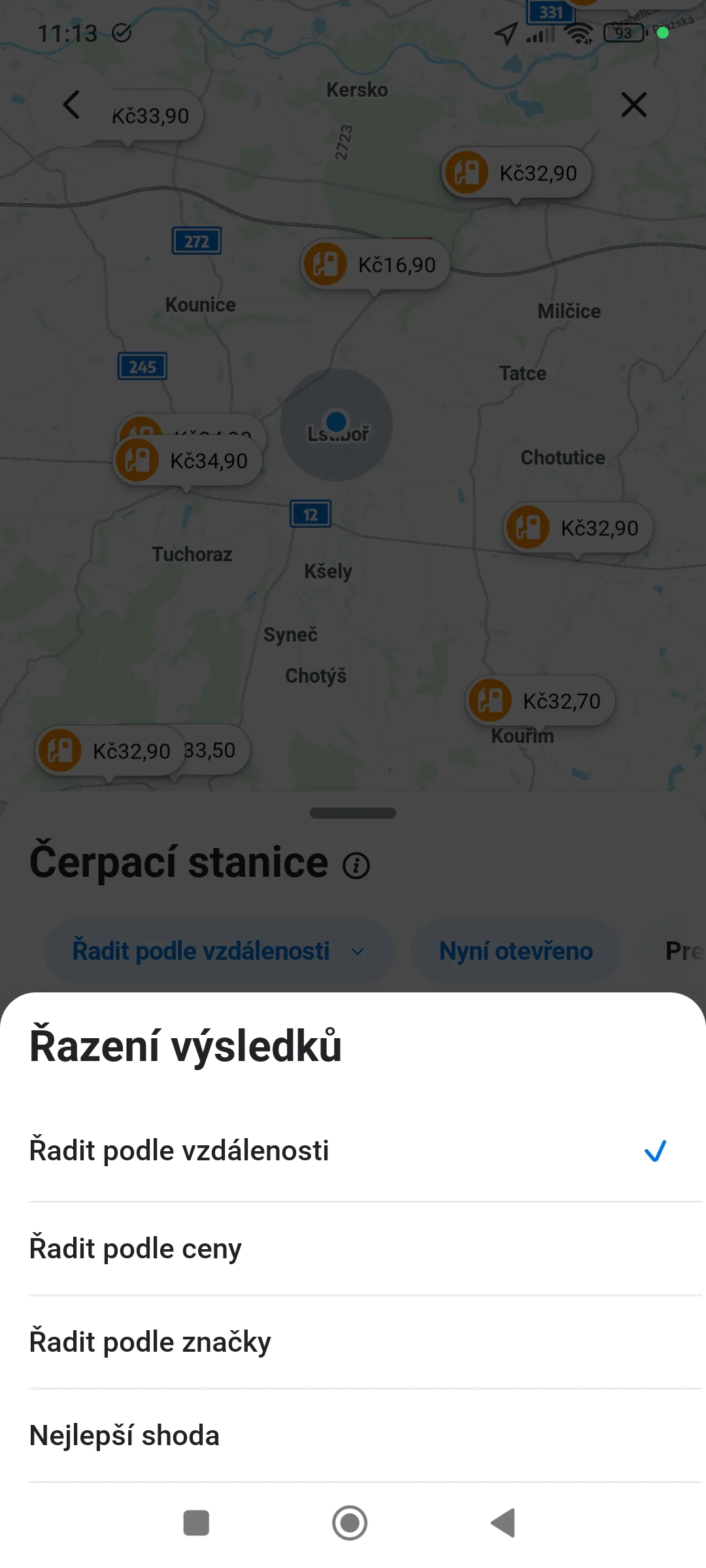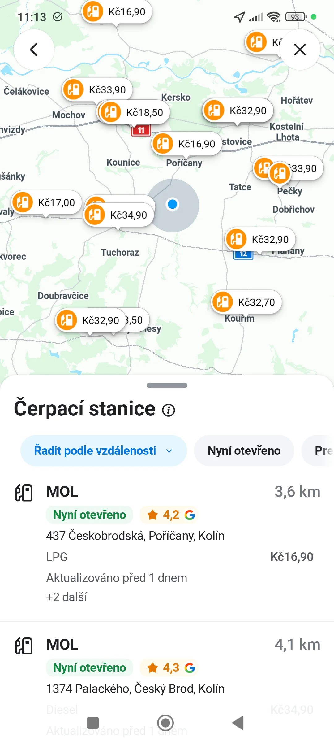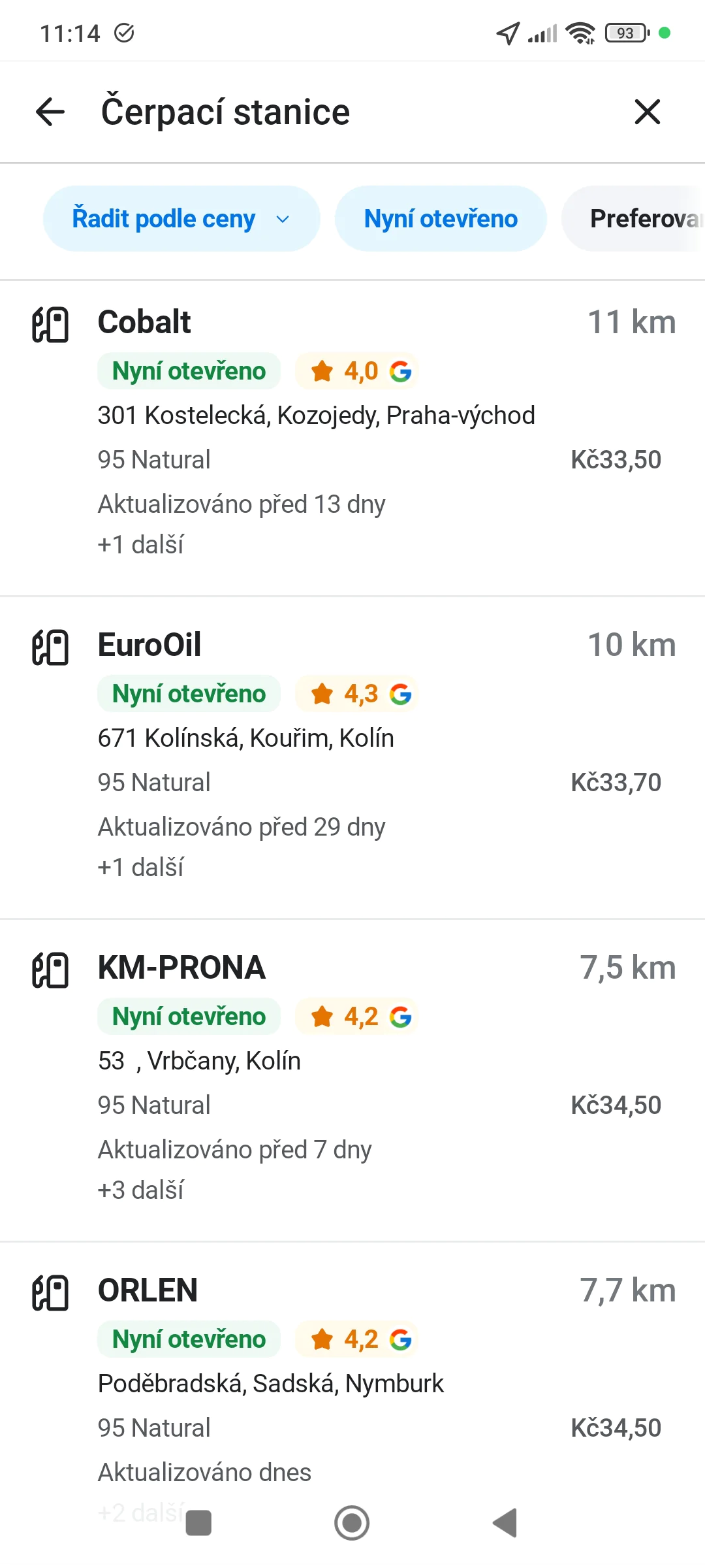 3. Algoritmus okamžitě vygeneruje seznam nejbližších stanic s uvedením ceny za základní typ paliva.