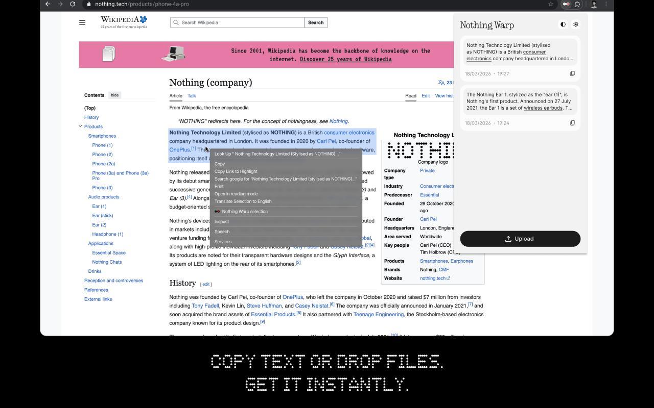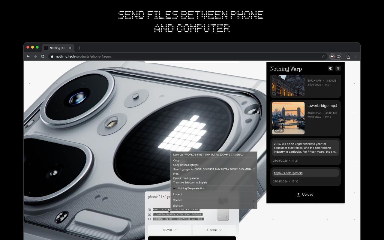 Na rozdíl od nativních protokolů, které jsou často vázány na konkrétní hardware nebo nízkoúrovňové API operačního systému, zvolil Nothing pragmatický a vysoce funkční přístup. Warp není jen další aplikací, ale kombinací mobilního rozhraní pro Android a rozšíření pro prohlížeče postavené na jádru Chromium.