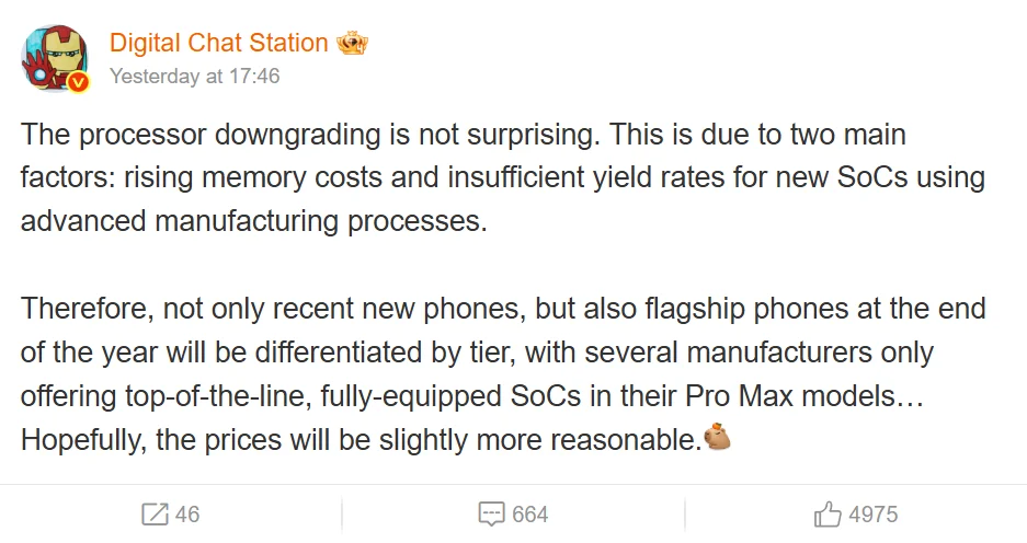 Podle informací z dodavatelských řetězců, které poodhalil známý insider Digital Chat Station, nás čeká výrazné rozdělení trhu. Rostoucí náklady na wafery a kritický nedostatek komponent vedou k tomu, že nejvýkonnější čipy se stanou exkluzivitou vyhrazenou pouze pro nejvyšší modelové řady, jako jsou varianty „Ultra“ nebo „Pro Max“.