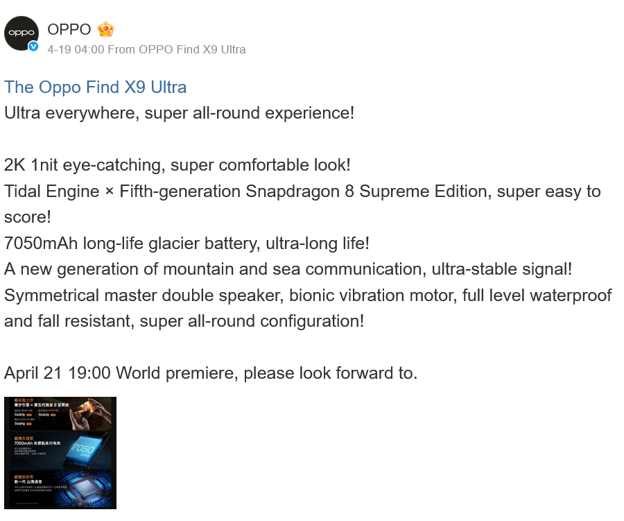 I když je fotografie v hlavní roli, zbytek specifikací zaostávat nebude. OPPO už na síti Weibo prozradilo, že Find X9 Ultra nabídne to nejlepší z aktuálního technologického světa: