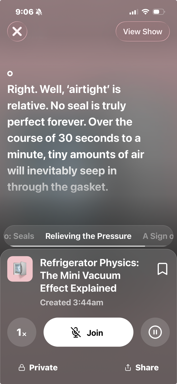 Výstup nepůsobí jako strohý syntetický hlas, ale jako organicky plynoucí podcast. Nejpůsobivější funkcí je však interaktivita. Podobně jako u NotebookLM můžete do vysílání vstoupit pomocí tlačítka „Join“ a klást doplňující otázky k tématům, která vás zaujala. Tím se pasivní poslech mění v aktivní dialog s umělou inteligencí.